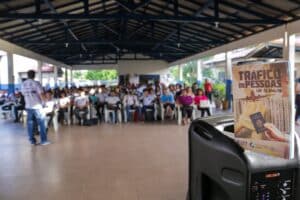 “Desde 2017, quando foi criado o projeto, a gente tem levado todas as informações, todas as nossas experiências aqui do Programa de Defesa dos Direitos Humanos para essas escolas, e, em todas as que a gente trabalha, geralmente tem relatos sobre tráfico de pessoas. Nem todos eles se tornam denúncias, mas a nossa equipe técnica faz os atendimentos”, destacou o coordenador do projeto Educar é Prevenir, Glauber Bastista.