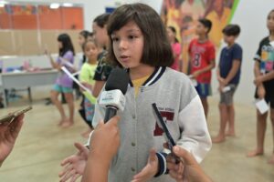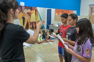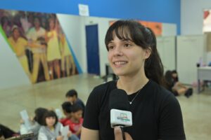 “Aqui, com os pequenos, focamos em dinâmicas lúdicas para desenvolver a coordenação motora e a expressão corporal, essenciais no teatro. Gradualmente, introduzimos a fala, oratória e interpretação de textos, o que também os ajuda na escola. Com os adolescentes, avançamos para um nível mais elaborado, trabalhando expressão corporal, oratória, expressão facial e leitura de textos”, informou Julia Barroso, professora da modalidade.